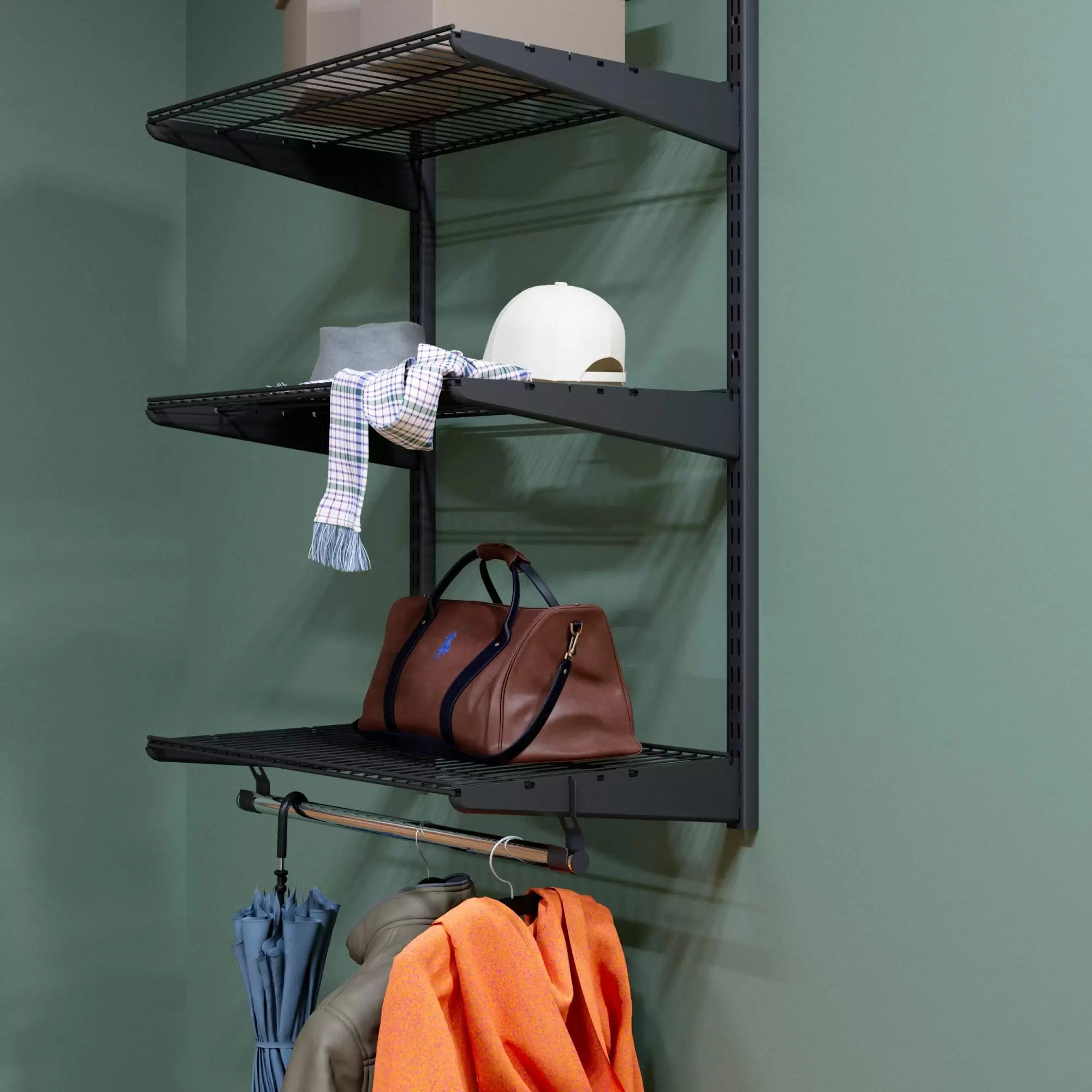 В комплект входят несущие рельсы и навесные направляющие, полки, штанги, аксессуары, крепежные элементы. Можно докупить множество дополнительных компонентов для гардеробной системы.