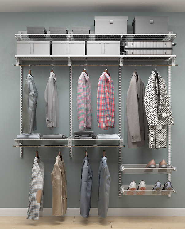 В комплект входят несущие рельсы и навесные направляющие, полки, штанги, аксессуары, крепежные элементы. Можно докупить множество дополнительных компонентов для гардеробной системы.