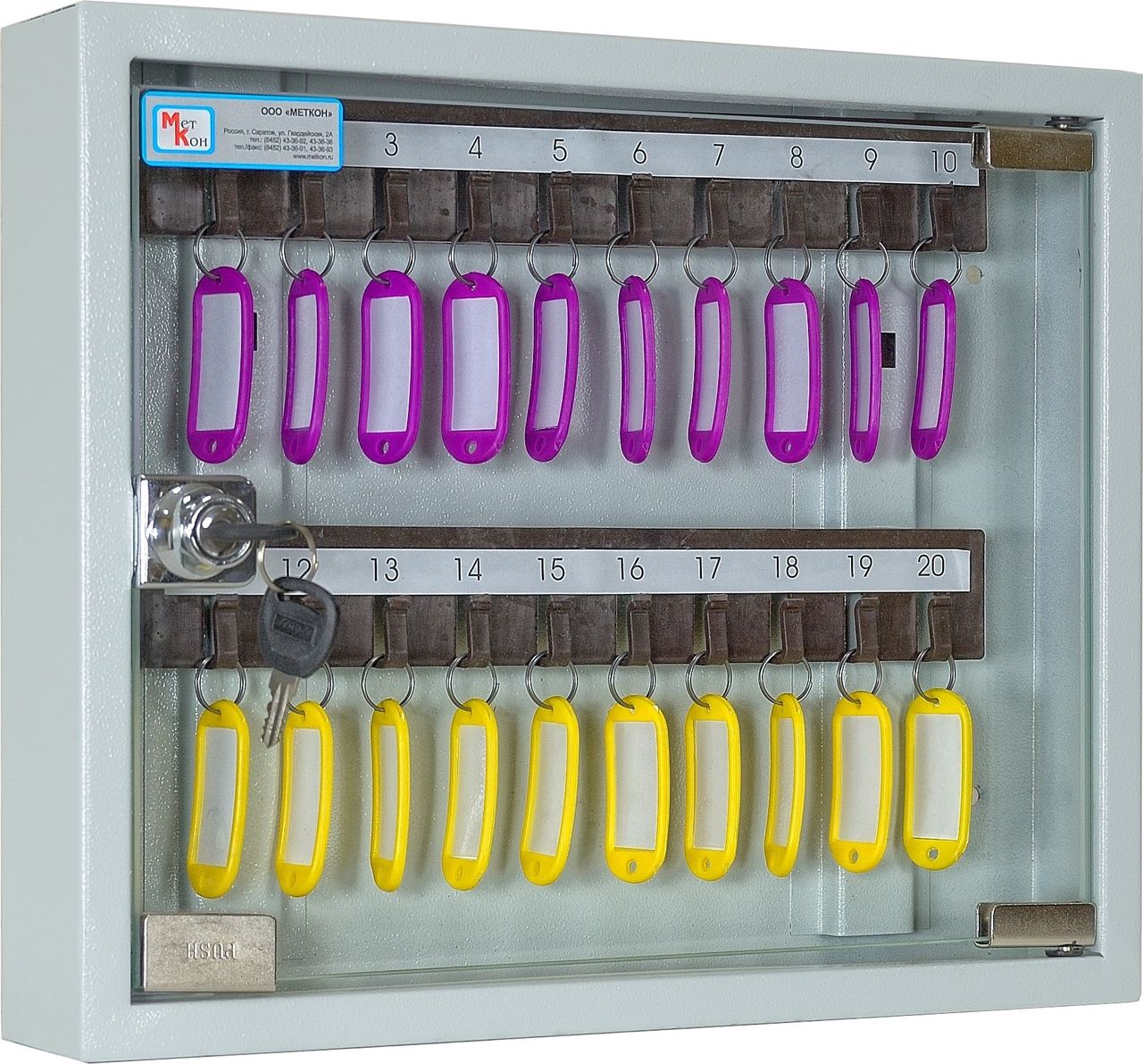 Ключница КЛ-20С предназначена для хранения 20 комплектов ключей. Лицевая панель — стекло мебельное. На задней стенке корпуса расположены отверстия для крепления. Ключница комплектуется 2 планками под навеску ключей. В дверь установлен замок типа «Cam-Lock».