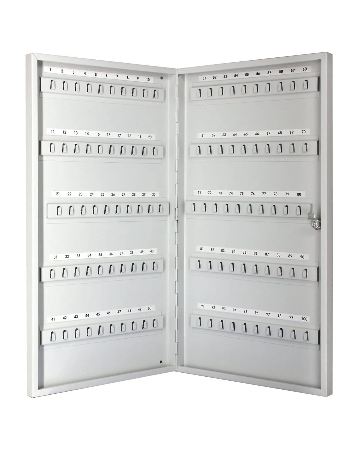 Ключница на 100 ключей представляет собой компактное устройство для удобного хранения большого количества ключей. Ключница комплектуется 10 планками с крючками, что позволяет легко организовать хранение и быстро находить нужный ключ.На задней стенке корпуса расположены отверстия для крепления. В дверь установлен замок типа «Cam-Lock».