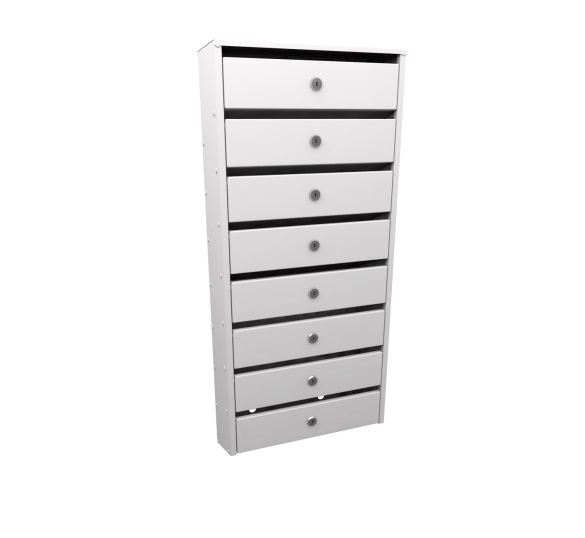 Узкие 8-и секционные почтовые ящики для подъездов многоквартирных домов серии «Сигма» с задней стенкой. Корреспонденция располагается в секции под углом 25 градусов.