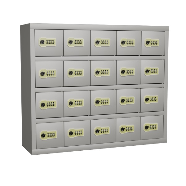 - Металлический шкаф с 20 запираемыми ячейками для хранения мобильных телефонов.