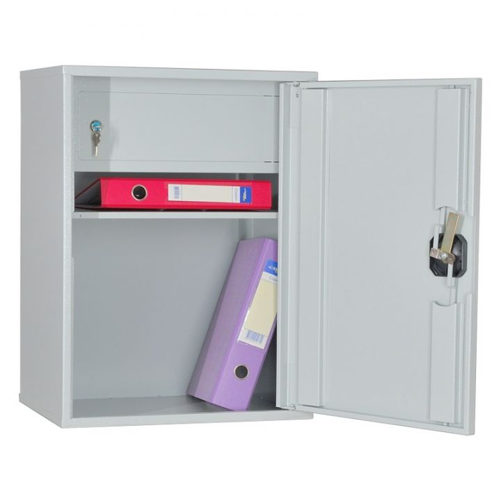 Шкаф офисный ШМ-62 ТМ предназначен для хранения бумажных документов. Корпус и дверь шкафа толщиной 1 мм. Шкаф односекционный, оснащен съемной полкой, с изменяемой высотой постановки и Трейзером. В двери установлен ключевой почтовый тяговый замок ЗАО «ЗП-053» г. Москва или аналогичный замок другого производителя.