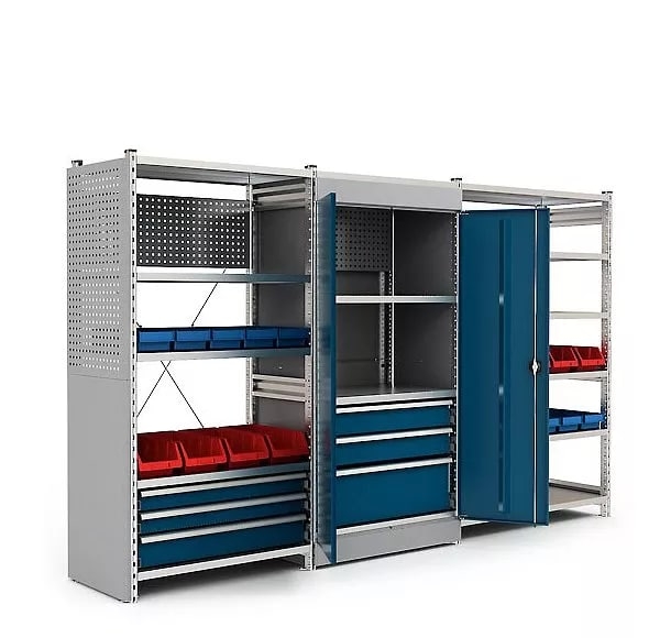 На картинке представлена одна из возможных вариаций комплектации. Вы можете собрать стеллажный комплекс как конструктор — из предлагаемых элементов. Наши консультанты с удовольствием Вам в этом помогут.