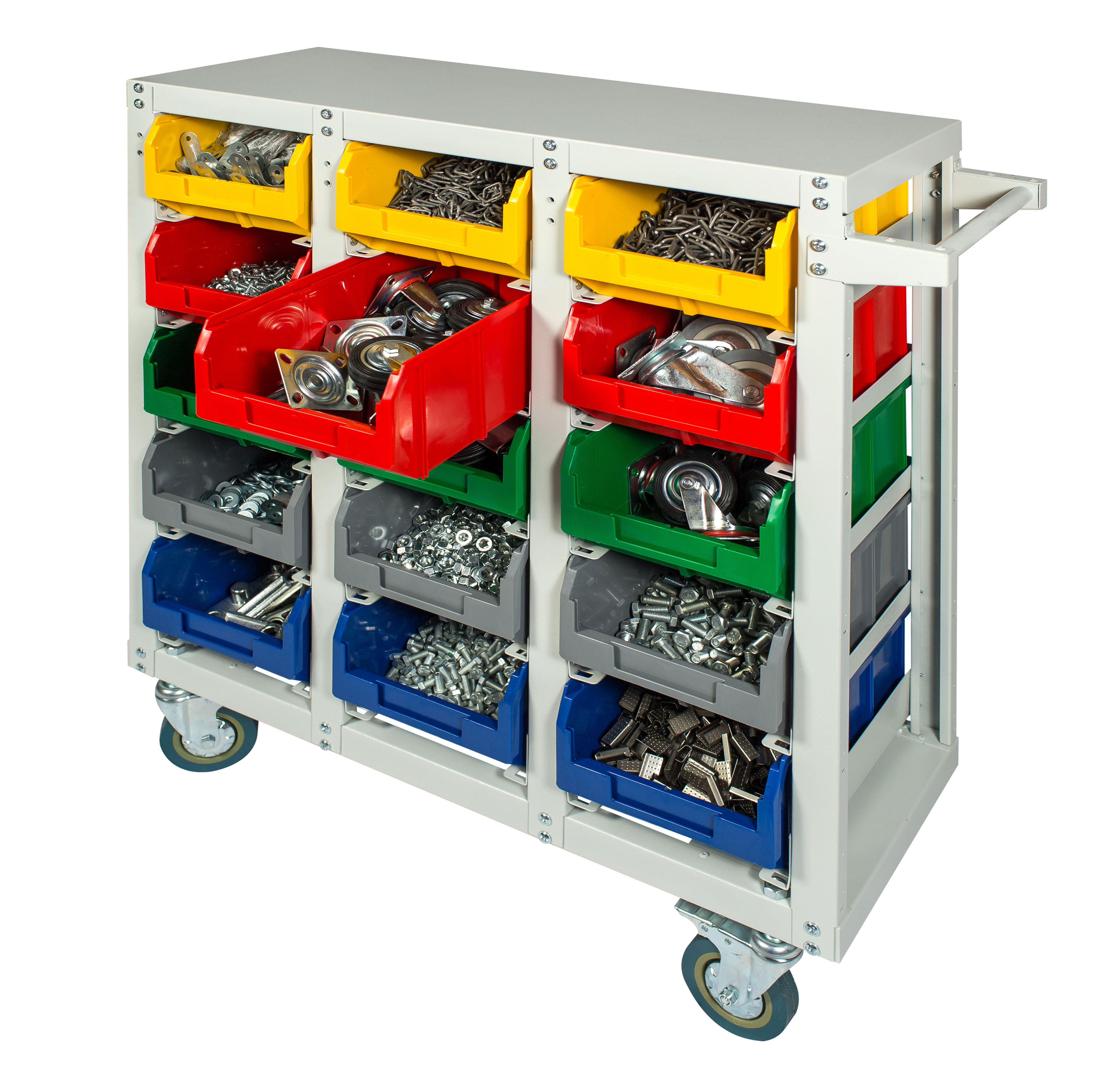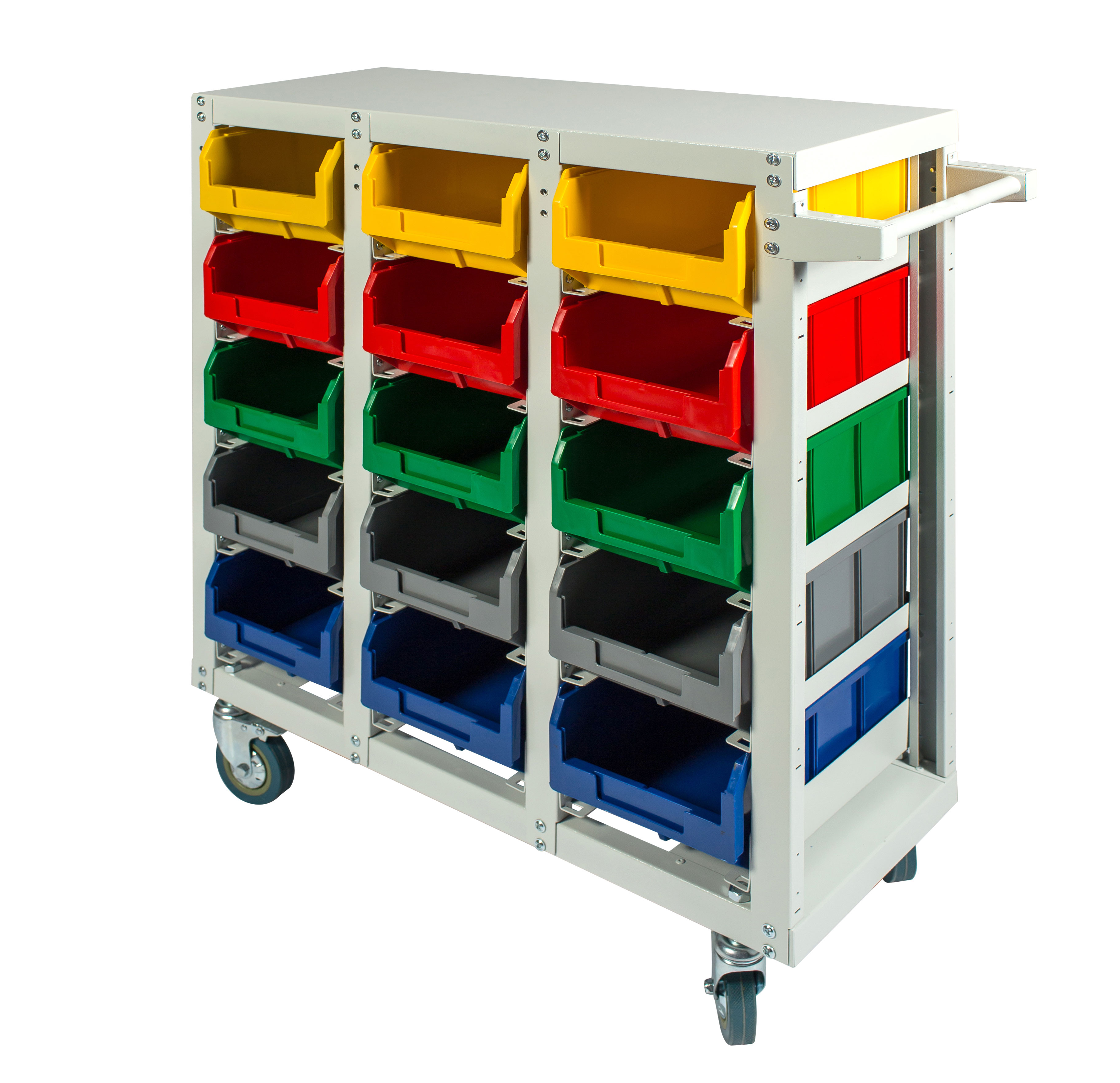 Стеллаж с направляющими мобильный односторонний V3-15 ячеек (125И), грузоподъемность 350кг. Предназначен для размещения контейнеров V-3 в отдельных ячейках на продольных направляющих. Подходит для эксплуатации в автомастерских, в строительных магазинах, на складах, где необходимо складирование мелкоштучных изделий и инструментов. При использовании вместе с колесами и ручкой, данный стеллаж становится мобильным, что значительно расширяет его функциональные возможности для перемещения вещей по территории предприятия, склада, цеха. Конструкция ящиков модели V3 обеспечивает быстрый и легкий доступ. Ящики открытого типа позволяют быстро находить нужные позиции, это возможно благодаря хорошему визуальному обзору содержимого. Конструкция стеллажа позволяет одним движением руки извлекать нужный ящик для его наполнения или опустошения, и так же легко устанавливать его на место. Стеллаж поставляется в разобранном виде и состоит из: металлического каркаса стеллажа с направляющими одностороннего V3-15 ячеек - 1 шт.; ящиков пластиковых модель V-3 - 15 шт.; комплекта итальянских колес Tellure Rota, резина, сталь диаметром 150мм.; ручки. Температурный режим эксплуатации от +20 до +70С.