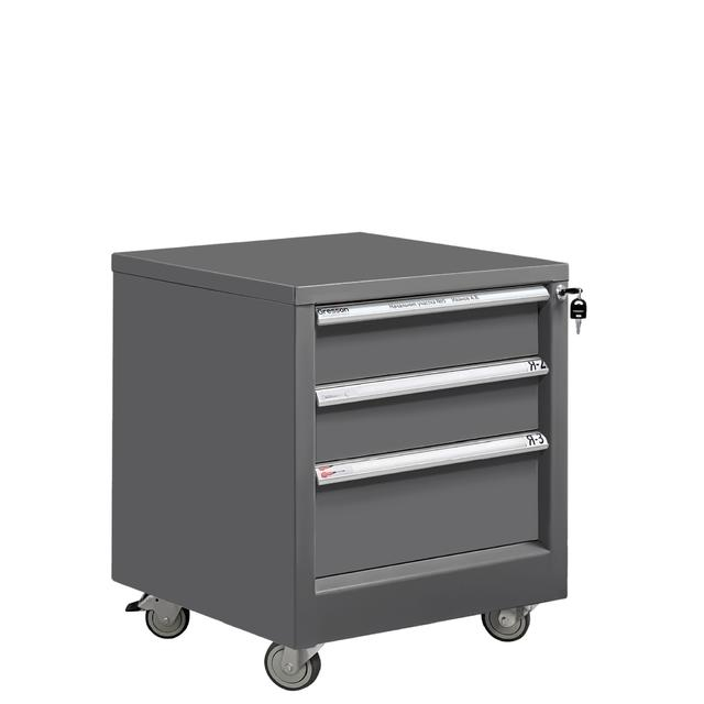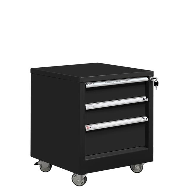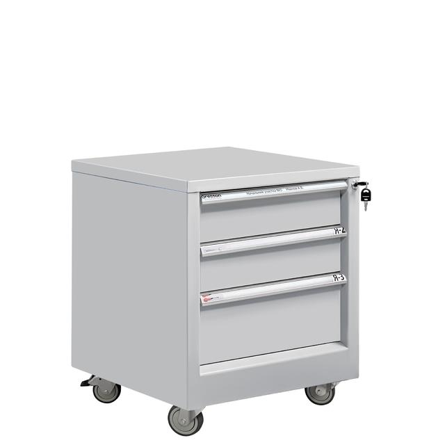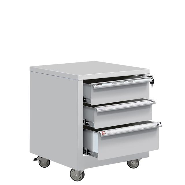 Все металлические тумбы Gresson оборудованы центральным замком для индивидуального доступа. Каркас и ящики тумб изготовлены из листового металла для увеличения эксплуатационного ресурса и повышения надежности. Ручки тумбы изготовлены из алюминиевого профиля с анодированным покрытием и боковые пазами, для установки обозначения (маркировки) ящиков по их прямому назначению (подразделение организации, документация, инструменты, материалы и т.д.). Ящики тумбы выдвигаются во всю длину, облегчая доступ к материалам. Тумба имеет 4 колеса (d-75 мм), два из которых с два с механизмом фиксации (тормозом).