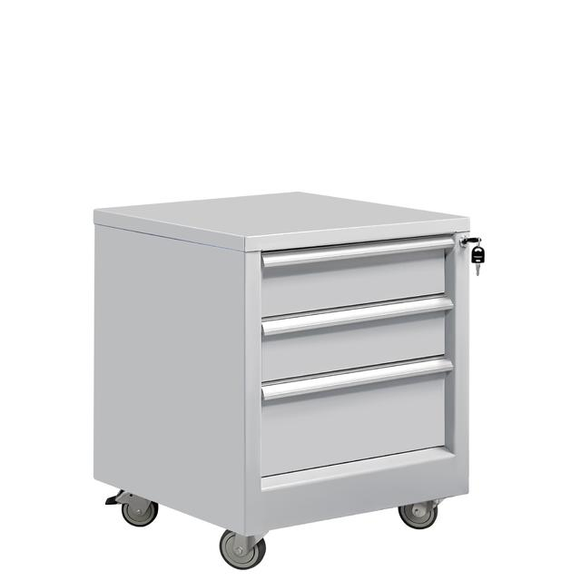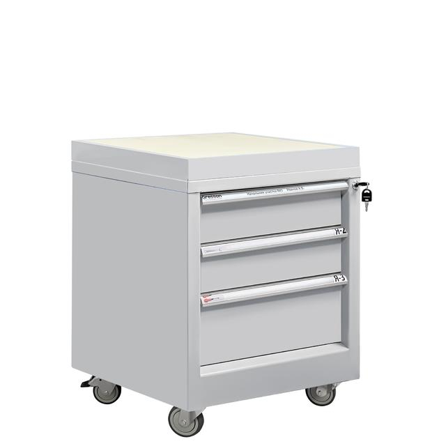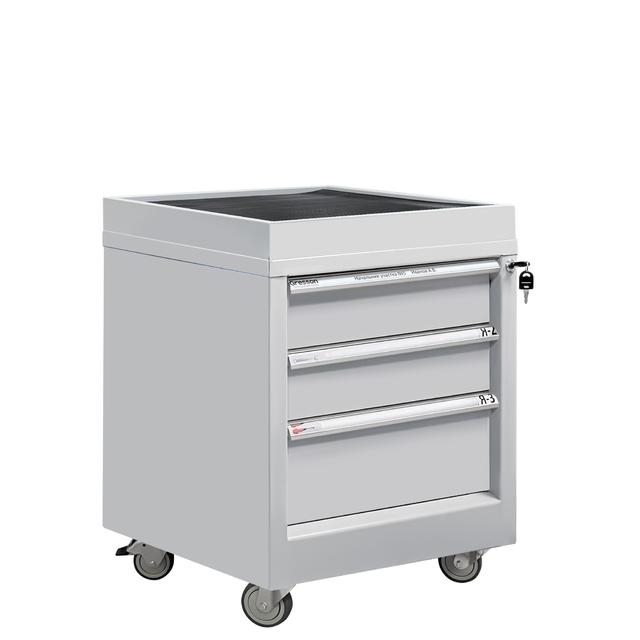 Каркас и ящики изготовлены из листового металла толщиной 1 мм, покрытого износостойкой порошковой краской светло-серого цвета RAL7035 с высокой стойкостью к химическим, термическим и механическим нагрузкам. Три выдвижных ящика на телескопических направляющих. Распределенная нагрузка на ящик 30 кг.