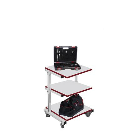 Стойка оснащена четырьмя колесными опорами, две из них с механизмом фиксации. Полки толщиной 22 мм изготовлены из ламинированного ДСП. Износостойкое покрытие из промышленного пластика обладает высокой стойкостью к термическим и механическим нагрузкам. Цвет боковой кромки полки фирменный бордовый, под заказ любой другой на Ваш выбор.