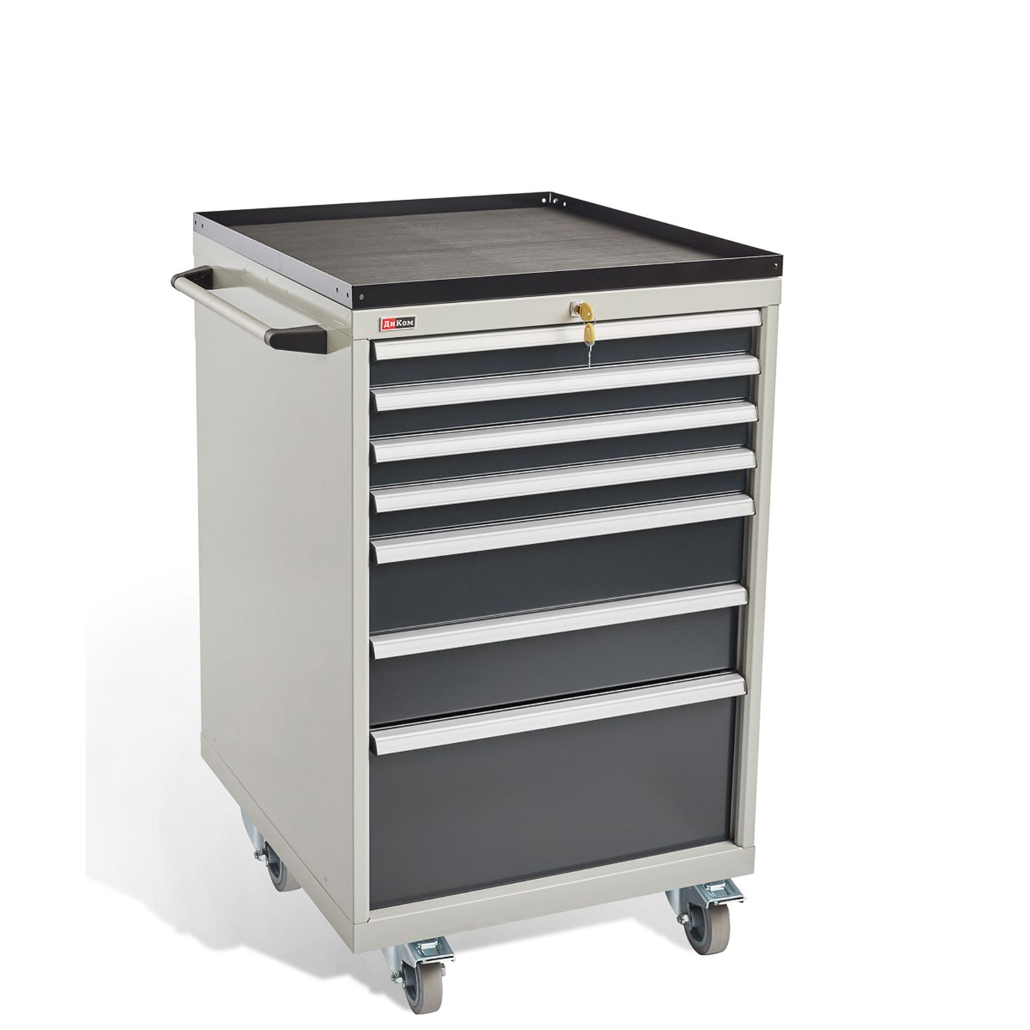 Тумбы окрашены эпоксидной порошковой краской, устойчивой к механическим воздействиям и агрессивным жидкостям: корпус и экран – серые RAL 7038; ящики и двери – антрацитовый серый RAL 7016.