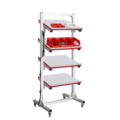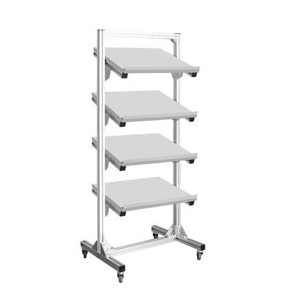 Стойка подкатная из конструкционного профиля СНП-КП — предназначена для размещения приборов, контейнеров для компонентов и их дальнейшего перемещения в рабочей зоне. Стойка оснащена четырьмя наклонными полками с упорами от скатывания которые раздельно регулируются по высоте и углу наклона. Высота стойки 1700 мм., ширина полок 690 мм., глубина полок 610 мм., четыре колесные опоры, две из них с механизмом фиксации. Конструкция позволяет оснастить стойку дополнительными полками и электропанелью на 6, 8, 12 розеток.
