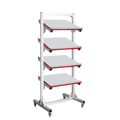Стойка оснащена четырьмя колесными опорами, две из которых с механизмом фиксации. Наклонные полки толщиной 22 мм изготовлены из ламинированного ДСП. Износостойкое покрытие из промышленного пластика обладает высокой стойкостью к термическим и механическим нагрузкам. Цвет боковой кромки полки фирменный бордовый, под заказ любой другой на Ваш выбор.