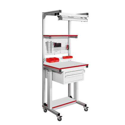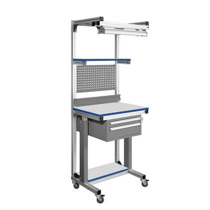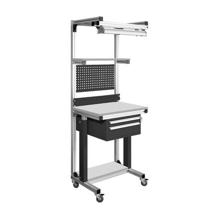 Стойка подкатная ремонтная из конструкционного профиля СР-КП — является мобильным рабочим местом, с возможностью перемещения оборудования и принадлежностей в рабочей зоне. Стойка оснащена: перфопанелью, инструментальной полкой с возможностью регулировки по высоте, нижней полкой, планкой для крепления лотков, подвесной металлической тумбой на 2 ящика, комплектом освещения светодиодным КОС-КП, четырьмя колесными опорами две из которых с механизмом фиксации. Высота стойки 1950 мм, ширина 700 мм, глубина 550 мм.