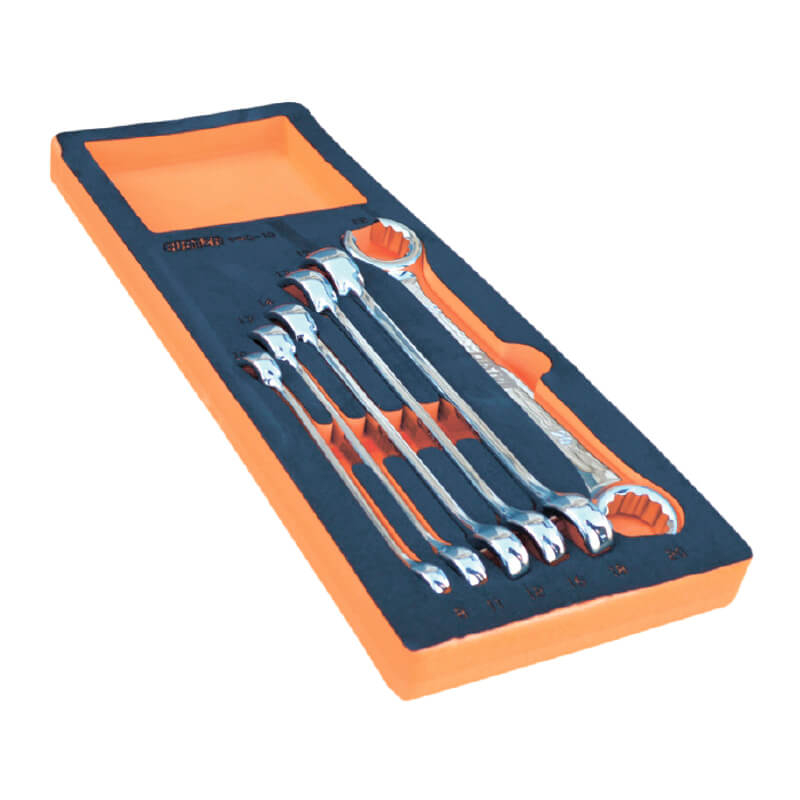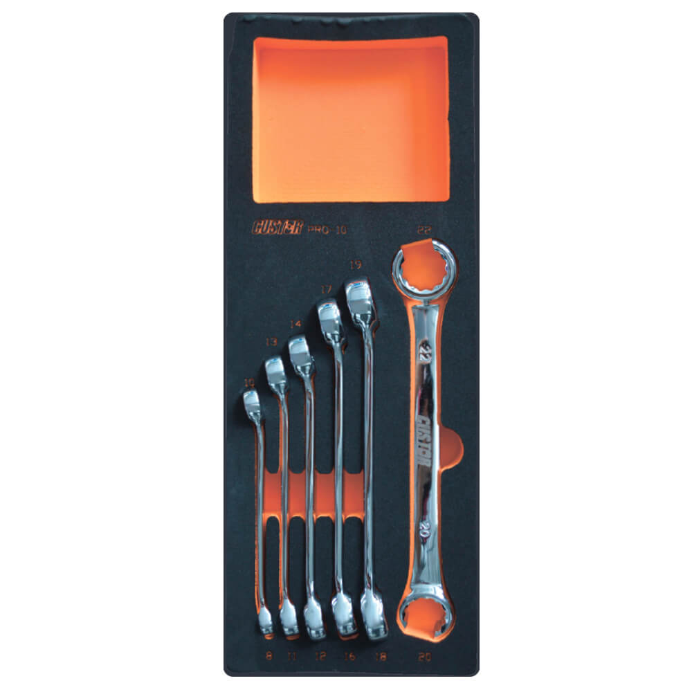 Набор разрезных ключей (8 x 10 мм, 11 x 13 мм, 12 x 14 мм, 16 x 17 мм, 18 x 19 мм и 20 x 22 мм) в ложементе VCS 1/4. Набор включает в себя 6 предметов.