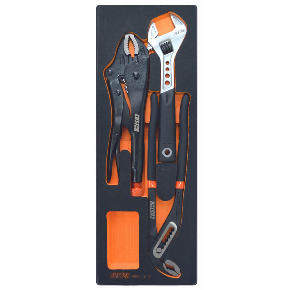 Набор шарнирно-губцевого инструмента (универсальные клещи, разводной ключ, зажим) в ложементе VCS 1/4. Набор включает в себя 3 предмета.