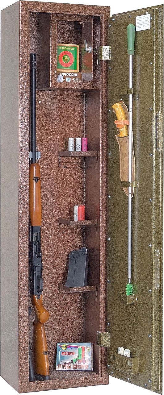 Сейф односекционный, на 2 ствола оснащен съемными полками и отделением под патроны. Ложементы — металлические держатели с резиновыми роликами. Максимальная высота устанавливаемого оружия — 1380 мм. Два замка ЗАО «Про-Сам» г. Рязань или аналогичные замки другого производителя.