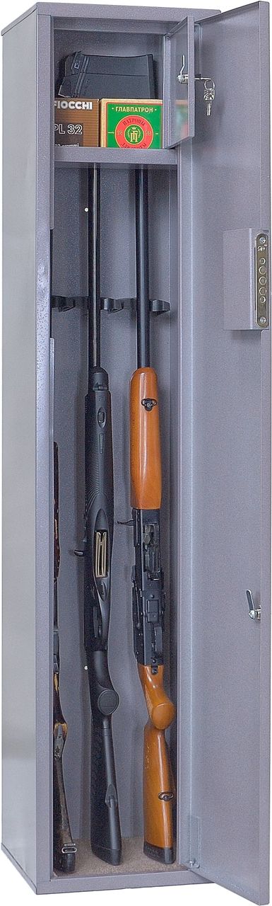 Шкаф односекционный, на 3 ствола оснащен отделением под патроны. Ложементы — пластик. В дверь установлены 1 замок типа «Cam-Lock» и 1 ключевой 8-ми сувальдный замок ЗАО «Про-Сам» г. Рязань или аналогичный замок другого производителя.