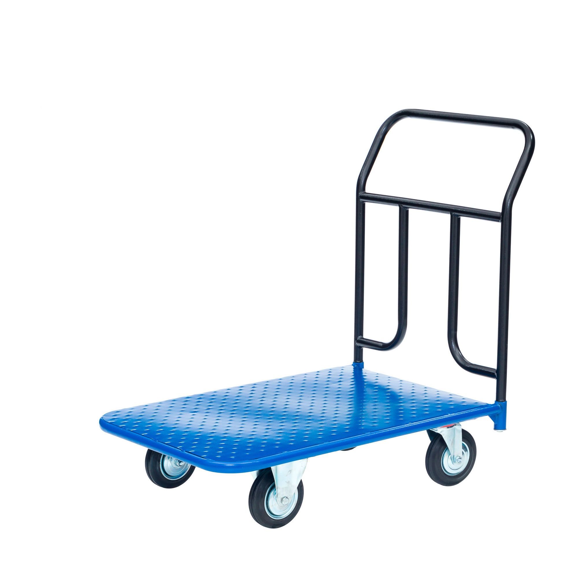 Платформенная 4-х колесная тележка КП-150 (500х800) используется для перемещения грузов. Ручка крепится к платформе болтами, для компактного хранения можно снять. Высота ручки 750мм., настил металлического листа толщиной 1,2мм. Платформа имеет уникальную рельефную полимерную противоскользящую поверхность. Цвет синий, шагрень. Для легкого перемещения тележка КП-150 комплектуется 2-мя поворотными и 2-мя неповоротными колесами, изготовленными из высококачественной литой резины.