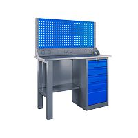 В качестве опор служат две тумбы. Они оснащены пятью ящиками, центральным замком. Верстак имеет экран, который содержит удобные подвески для инструментов. Изделие покрыто качественной порошковой краской, которая не трескается со временем.
