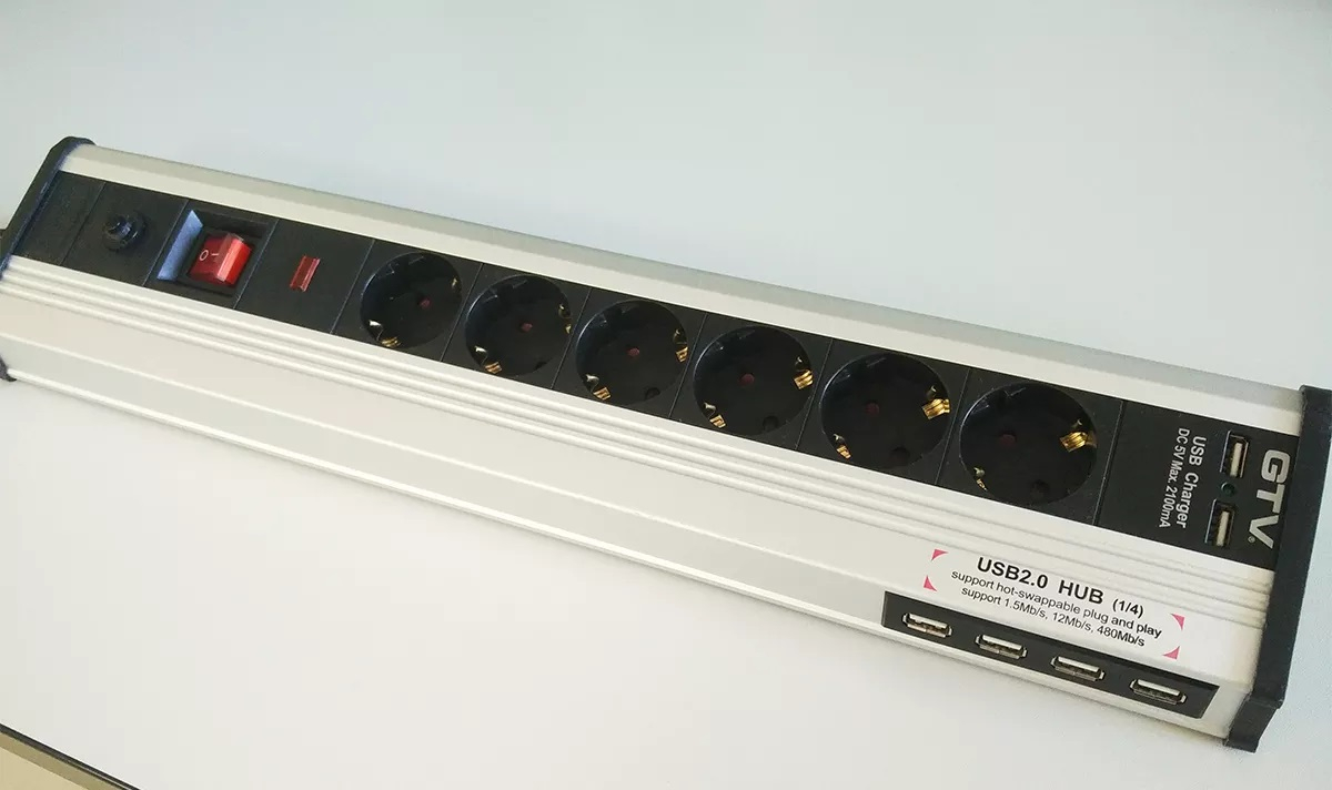 Сетевой фильтр на 6 розеток устанавливается на монтажные столы и верстаки ДиКом как альтернатива коробу для коммуникаций.