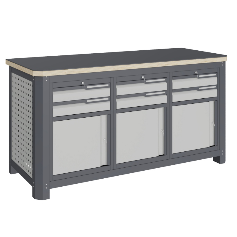 Верстак серии MECHANIC: MCN 1552.S999 состоит из столешницы шириной 1493 мм, рамы верстака, состоящей из опор, перемычек, боковых перфопанелей, трех малых модулей S9.