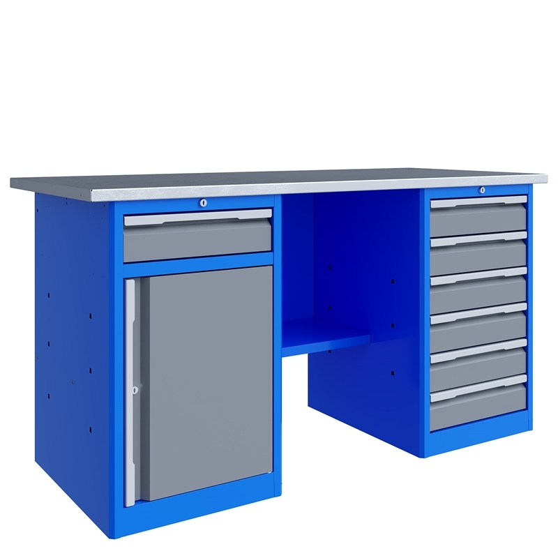 Тумбы верстаков выполнены сварными. Ящики в тумбах устанавливаются на шариковых телескопических направляющих полного выдвижения. В тумбе P6 установлено шесть малых ящиков. Внутренние размеры малых ящиков (ВхШхГ), не более: 103 х 397 х 520 мм. Тумбы с ящиками снабжены общим центральным замком с поворотом ригеля 180 градусов и подпружиненной тягой. В тумбе P8 установлен малый ящик и имеется отделение с дверью и одной полкой. Ящик снабжен центральным замком с поворотом ригеля 180 градусов и подпружиненной тягой. Полка устанавливается на парах специальных формованных зацепов, выполненных в боковых стенках тумбы. Имеется возможность смены стороны открывания двери. Дверь тумбы снабжена центральным замком с поворотом ригеля 180 градусов. В комплекте имеется два ключа с каждым замком.