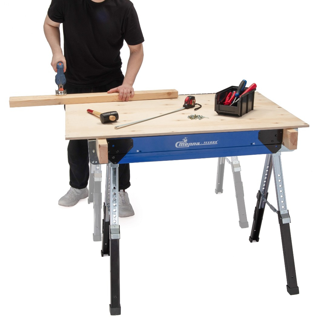 Складные козлы имеют 2 ложемента для распила длинномерного бруса или для установки связывающих брусьев размером 47x100мм, что позволяет увеличить рабочую поверхность и обеспечивает жесткость конструкции рабочего места. Также включает в себя новаторские опоры для временного хранения и поддержки листового материала, которые дают возможность вертикальной фиксации и простого и быстрого раскроя листовых материалов.