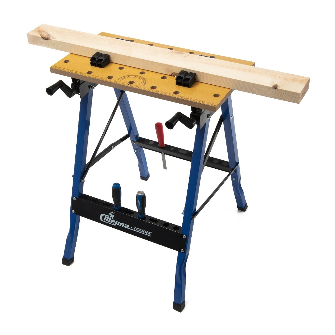 Верстак универсальный имеет две деревянные, подвижные столешницы с V образными пазами для зажима прямоугольных деталей. Столешницы двигаются по направляющим металлическим опорам (с помощью двух ручек) под необходимый размер заготовки.