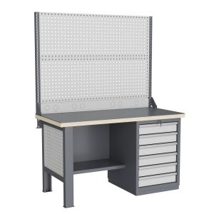 Верстак может комплектоваться одинарным или двойным перфорированным экраном, электромонтажным блоком для установки розеток и дополнительных устройств, а также комплектом освещения с держателем и лампой. Перфорация экрана подходит под стандартные держатели для инструментов, отверток, крючков, полок. Возможна комплектование верстака навесным элементами (держатели, крючки, полки).