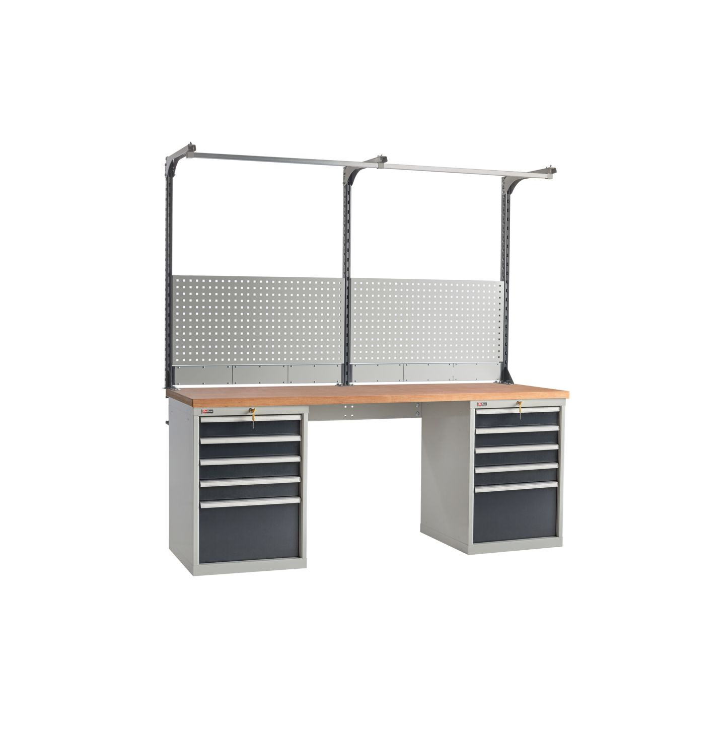 Металлические элементы верстаков окрашены эпоксидной порошковой краской, устойчивой к механическим воздействиям и агрессивным жидкостям. Ящики, дверцы тумб и стойки экрана – цвет антрацитово-серый RAL 7016, остальные элементы – цвет серый RAL 7038.